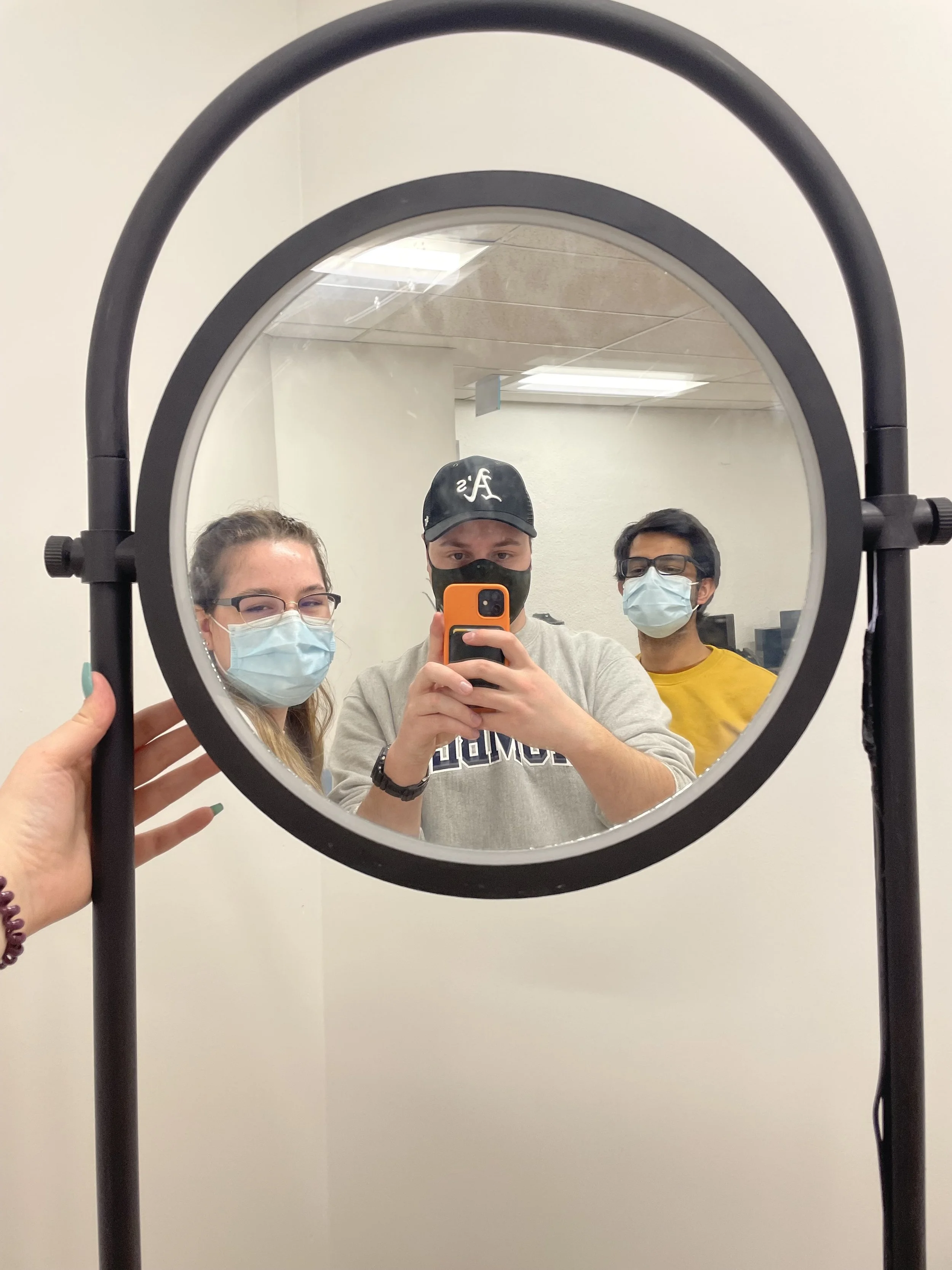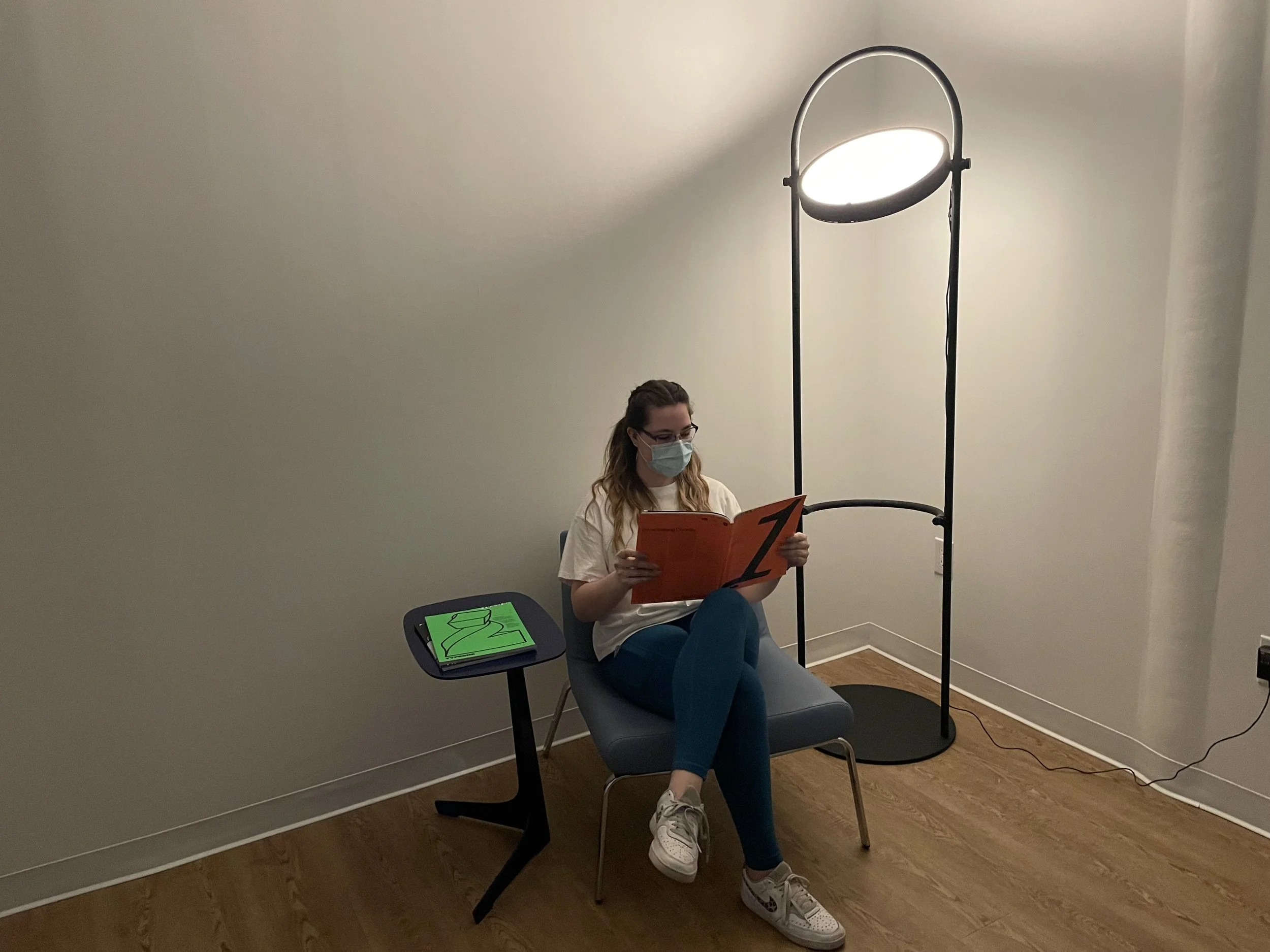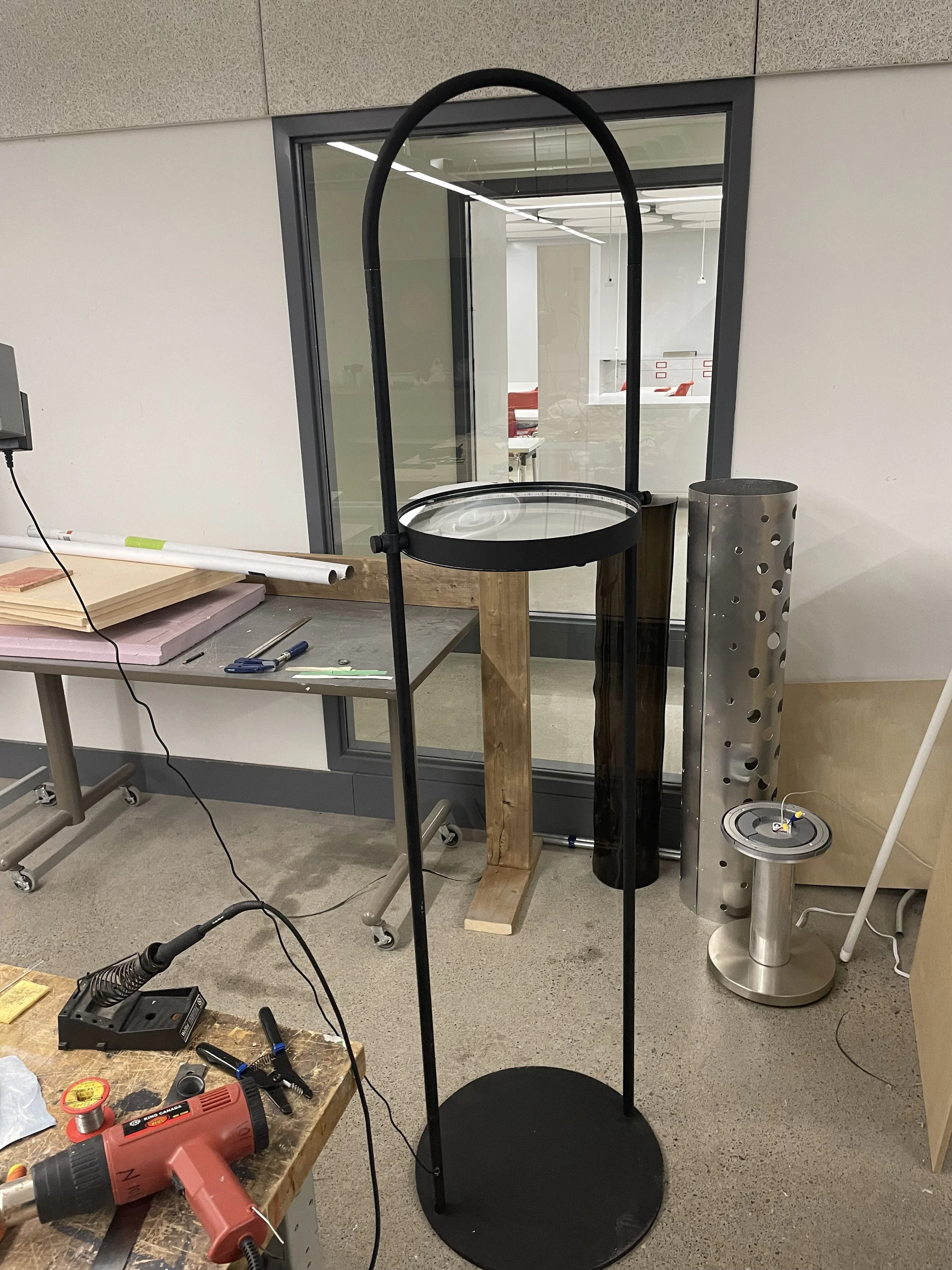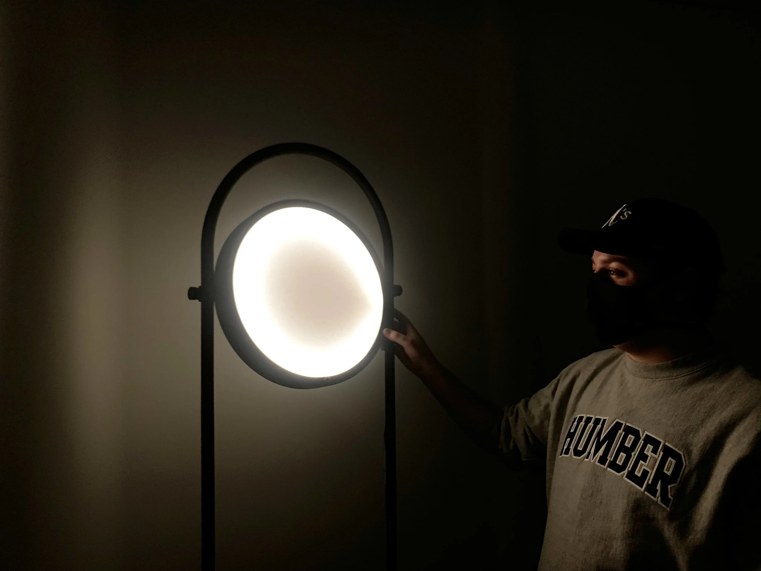 The goal for this project was to design a light that fits into a small living space such as an apartment, while matching the aesthetics of Anony. The light features a disk with a light panel. The opposite side features a mirror enclosed by a ring light. The height of the disk can be adjusted eye level and also lowered to form a table at the bottom position.